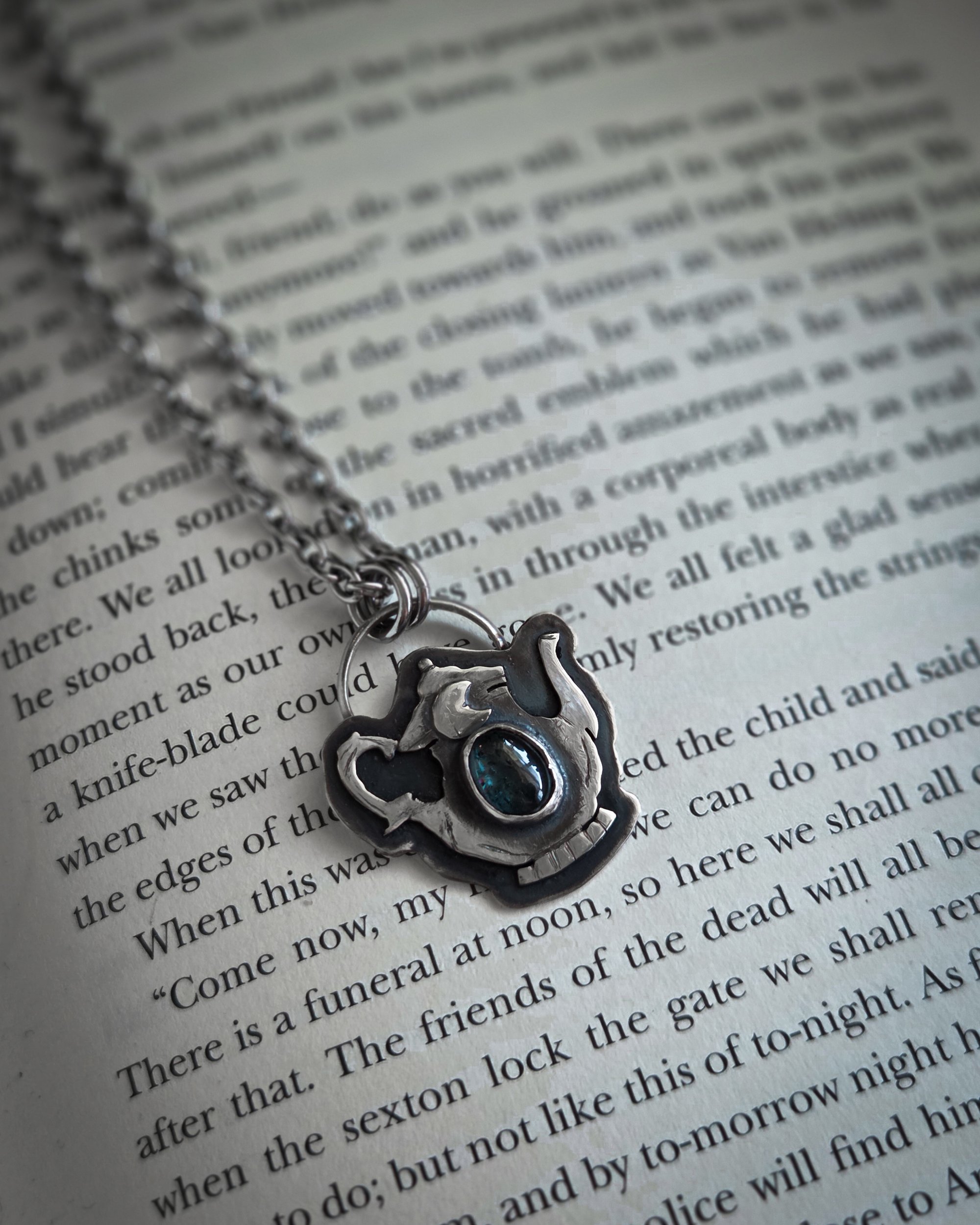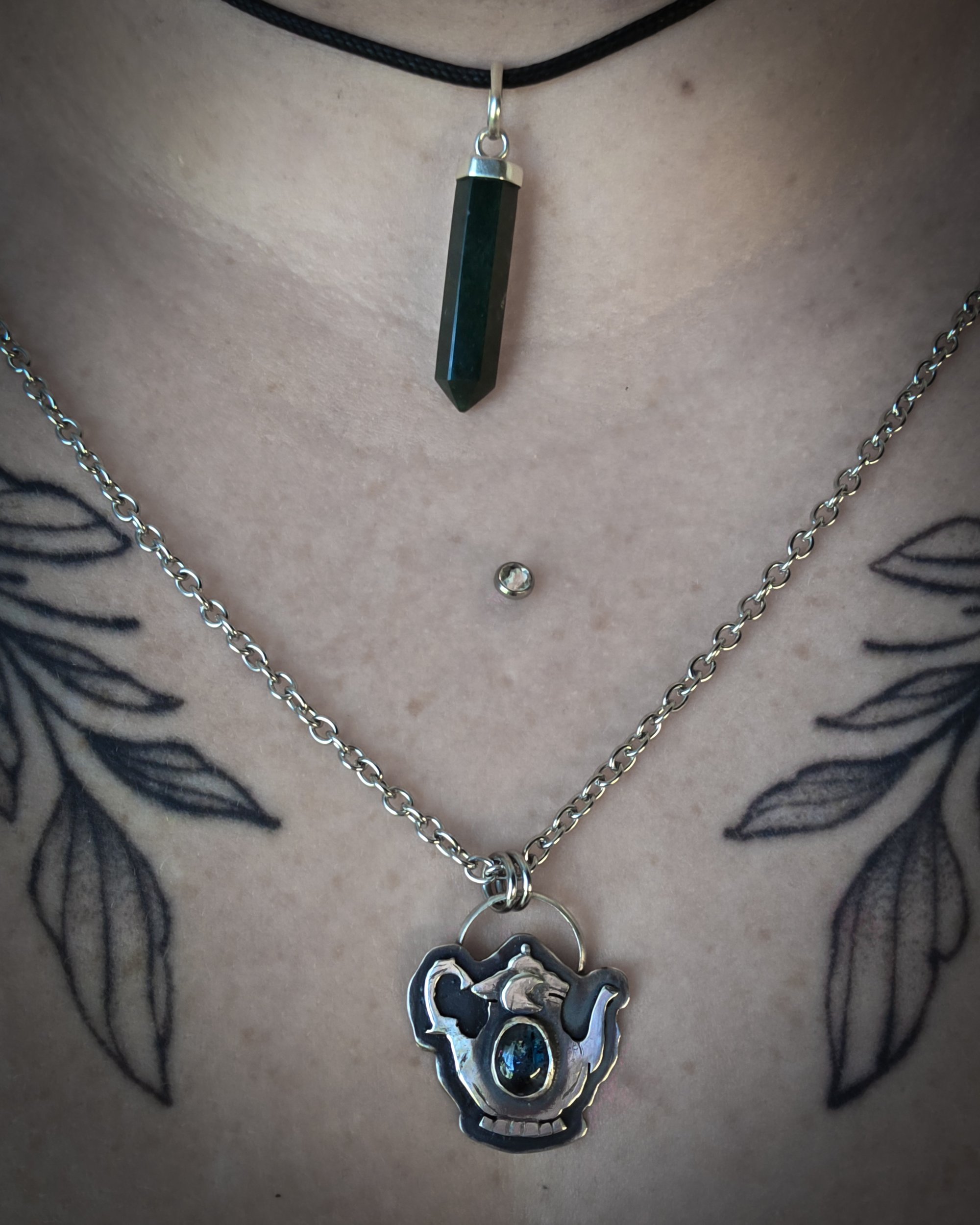 Sterling silver tea pot with deep blue kyanite stone and moon detail